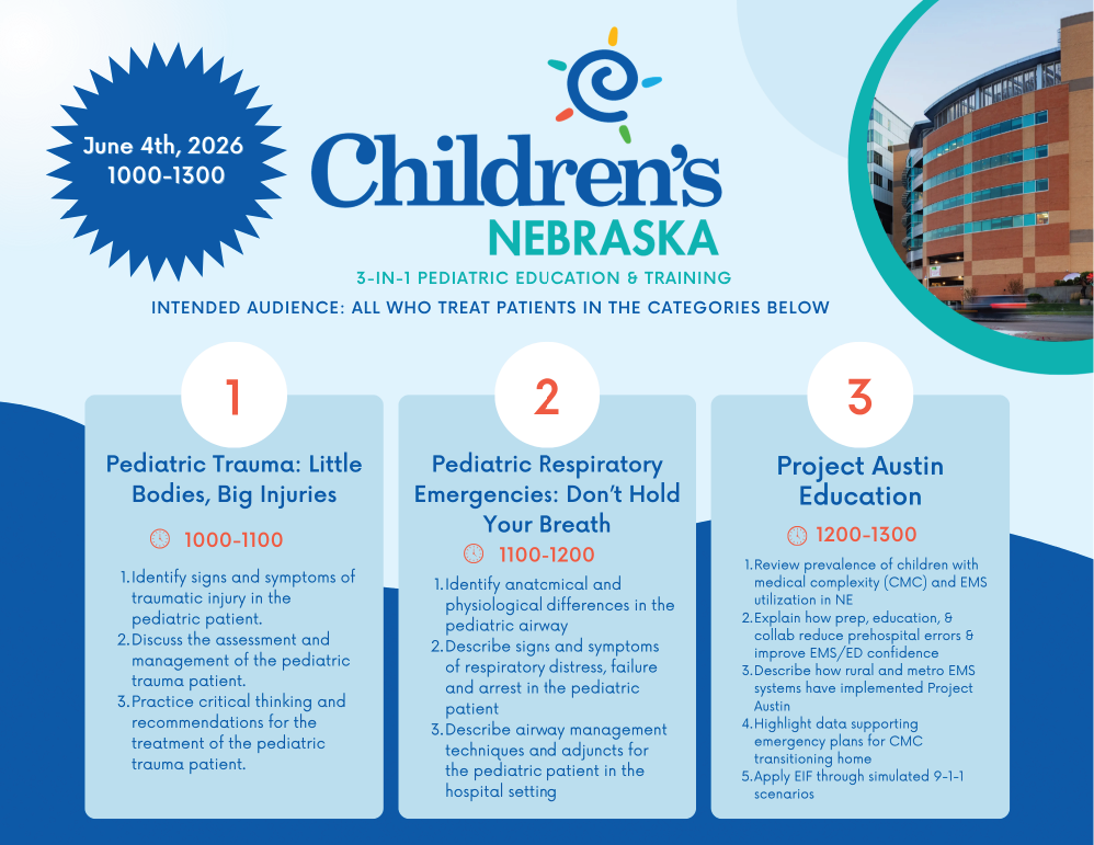 SAVE THE DATE June 4th, 2026, from 1000-1300 for Children's Nebraska to provide in-person education on 3 topics- pediatric trauma, pediatric respiratory emergencies, and Project Austin.